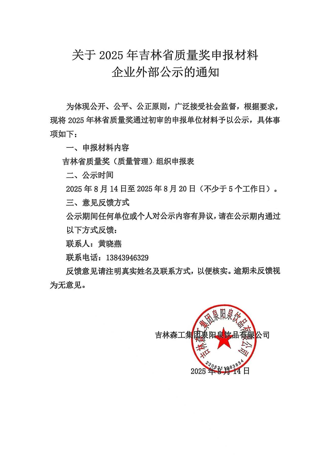 關(guān)于2025年吉林省質(zhì)量獎(jiǎng)申報(bào)材料企業(yè)外部公示的通知